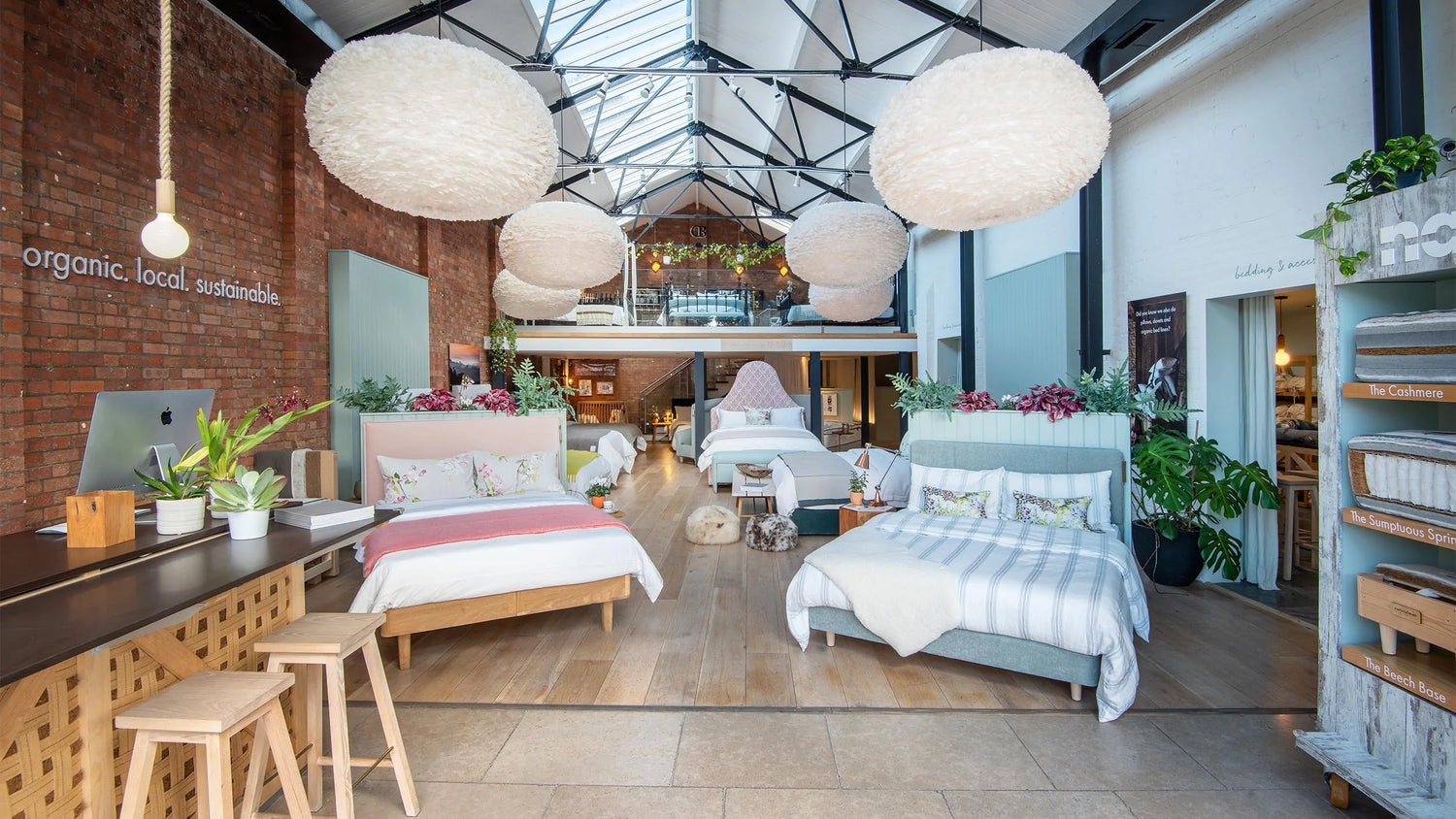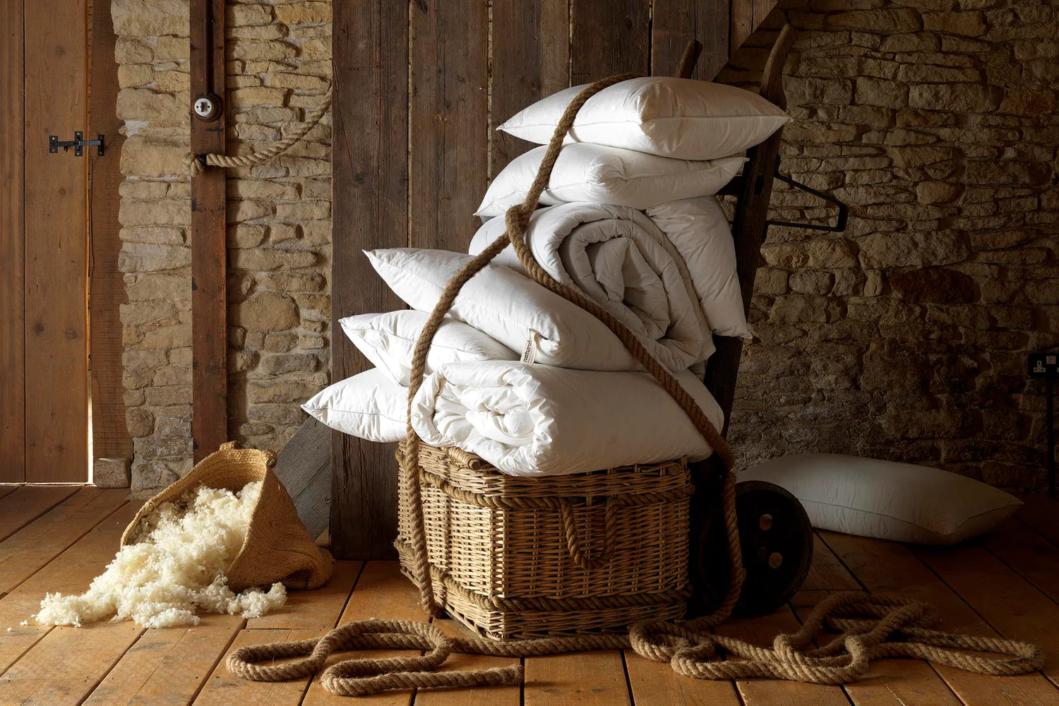ull frá Devon, 500 þráða rúmfötum og sængurfötum, mjúkum fjöðrum og hand tíndum dúni frá Skotlandi og GOTS-vottaðri lífrænni bómull.