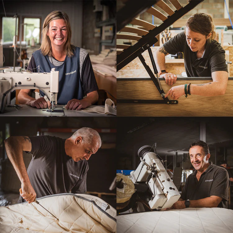 Síðan 1999 höfum við handgert lífrænar dýnur og rúm í verkstæðinu okkar á bökkum árinnar Exe í Devon með því að nota aðeins bestu efni sem náttúran hefur að bjóða. Við kaupum allt okkar hráefni beint frá uppsprettu, við framleiðum allt sjálf undir einu þaki og seljum aðeins beint til þín, í okkar eigin sýningarsölum og á okkar eigin vefsíðu. Við stjórnum öllu ferðalaginu, frá sauðfjárbúi í Devon til svefnherbergisins þíns, til að veita þér bestu mögulegu upplifunina og að lokum besta nætursvefninn. Þetta er hægari, ígrundaðari, sjálfbærari nálgun við rekstur og vöxt svona fyrirtækis og það er eina leiðin til að gera það.